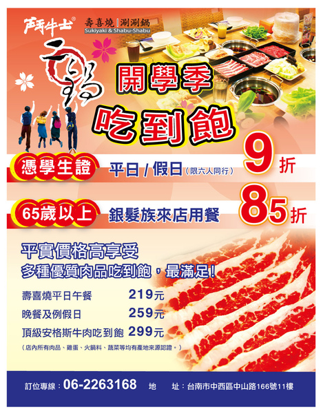 ~ 安格斯牛吃到飽299 ~ *憑學生證平日/假日(限6人同行)九折 65歲以上銀髮族來店用餐85折 網址: http://www.gomag.com.tw/062263168.html