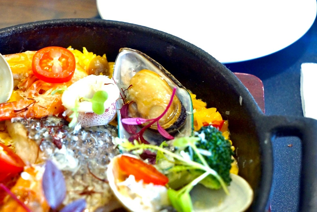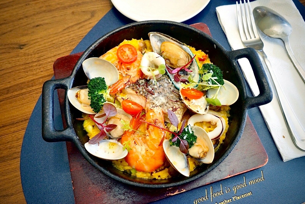 番紅花,全世界最貴的香料。70000朵番紅花,才能製成⼀磅番紅花蕊,這就是為什麼,它比黃金還貴?具有花香及蜜甜香的濃郁香氣,是標準西班牙燉飯的主要香料。這道沒有⼀般西班牙燉飯那麼硬,米飯部分為泰國香米,香氣更勝一籌。