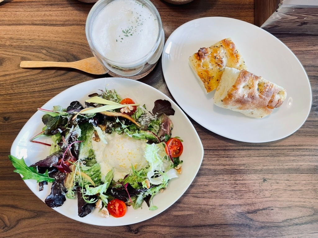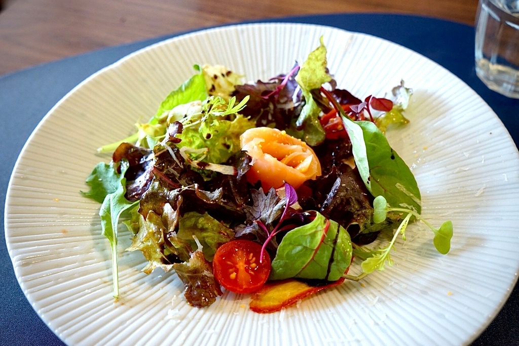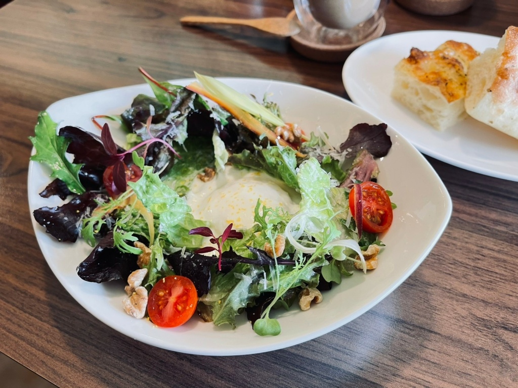 沙拉的菜⾊豐富,中間⼀顆半熟蛋,有給我幸福感。