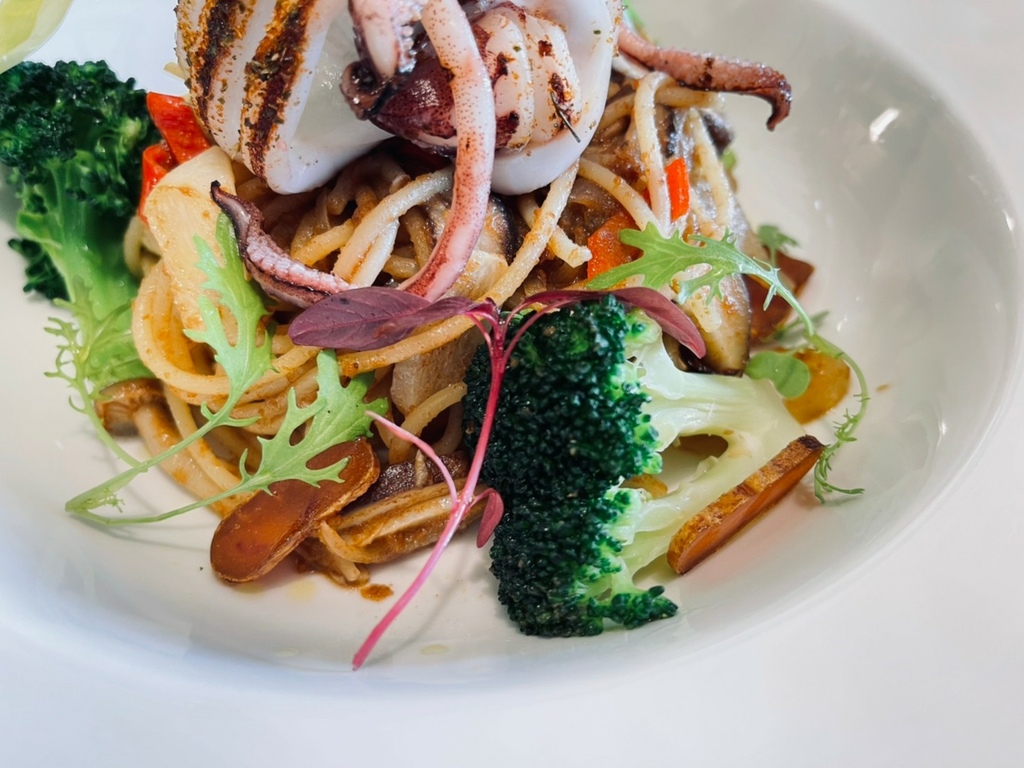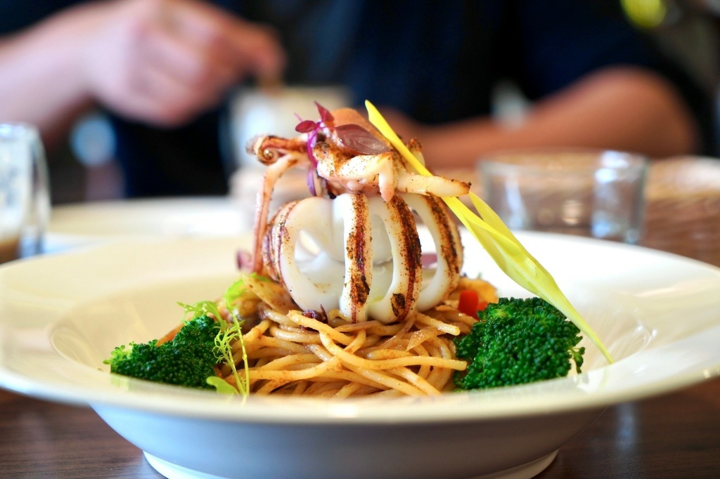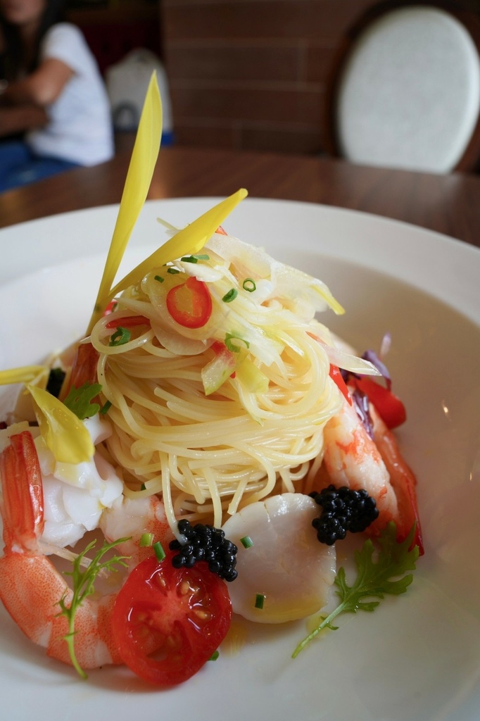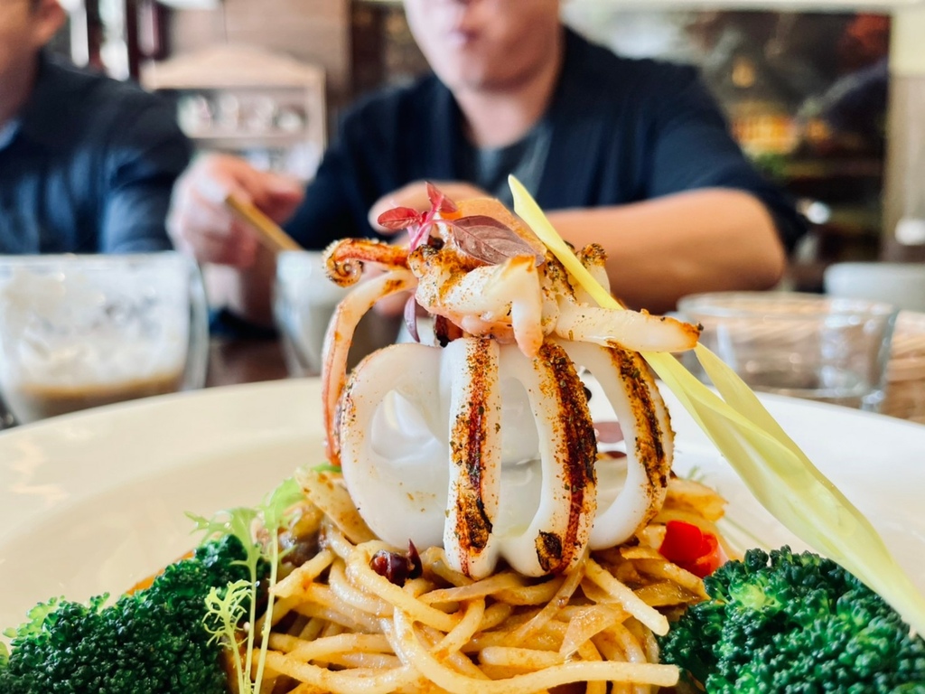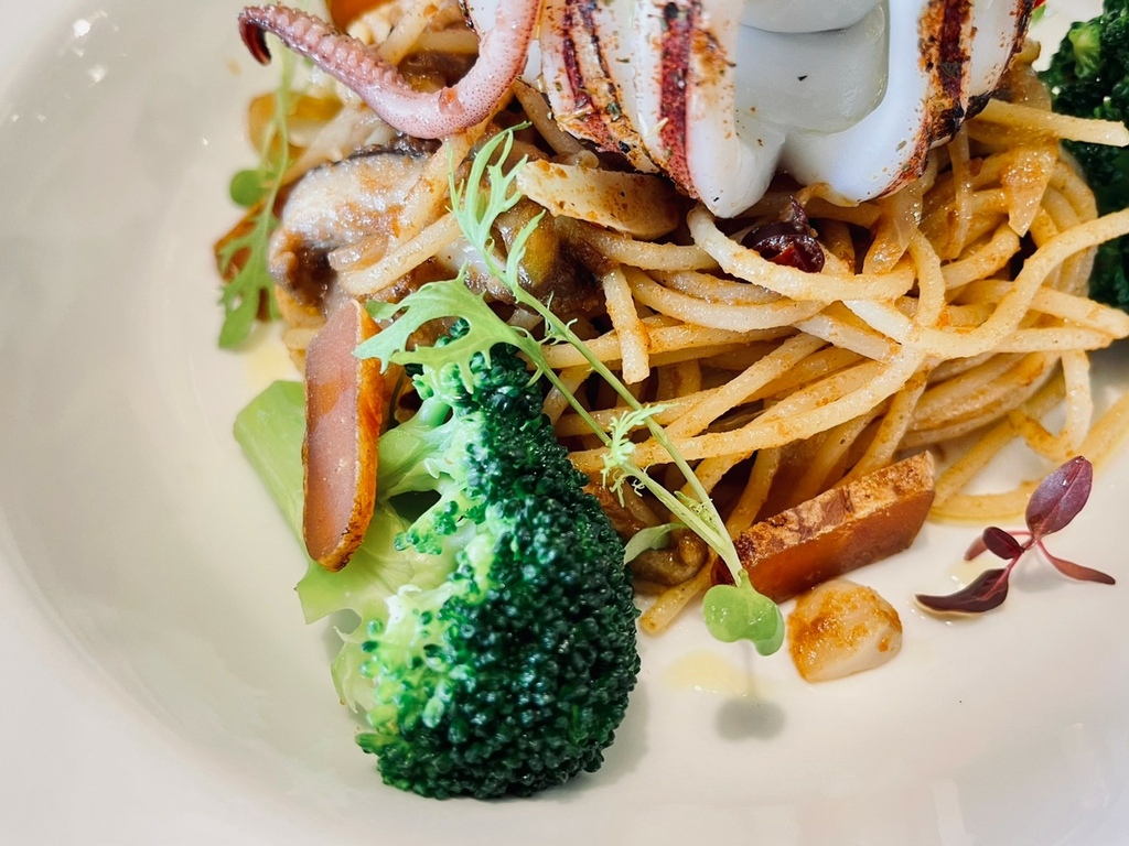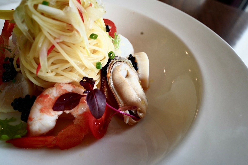 義⼤利本⾝就是有烏⿂子的國家,⽽烏⿂子又是台灣的強項,暖⼼廚師把烏⿂子直接入到菜⾊裡面去。先把烏⿂子烤乾了,再把它磨成細粉,然後再與配料輕炒,搭配四尾⼀⽄⼤小的小捲,這個⼤小最好入口,⾁質豐嫩帶Q,滿嘴烏⿂子配上濃海味,著實幸福,著實佩服。