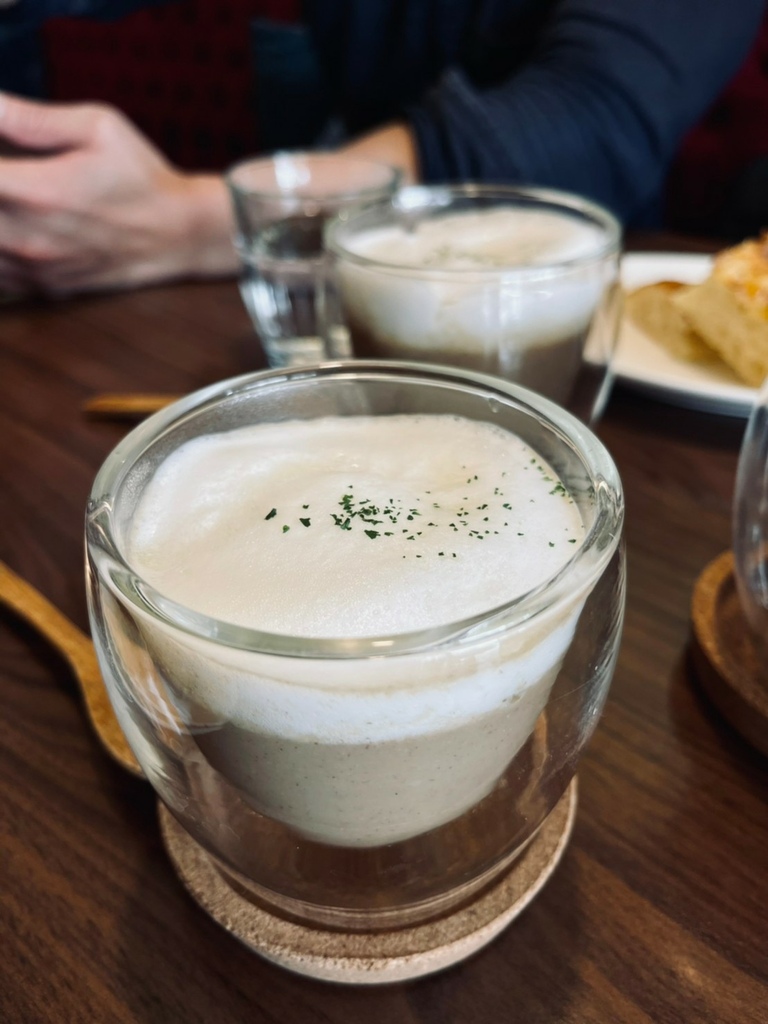 濃湯上桌時,⼤家還搞烏龍,以為是咖啡...菌菇濃湯,視覺告訴你是咖啡,口感卻是濃濃的菌菇濃湯,真的非常有趣,好喝!