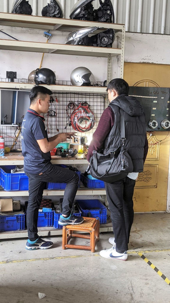 ▼朋友正在跟師傅討論想做的車燈,WS遇見光的有自己獨家開發的魚眼,因為覺得原廠的大燈不夠亮,除了換魚眼,好友也升級搭配了hid,跟原廠鹵素燈泡比起來,hid燈泡是鹵素燈泡的2-3倍亮度,再搭配安裝ws魚眼,亮度更提升好幾等!