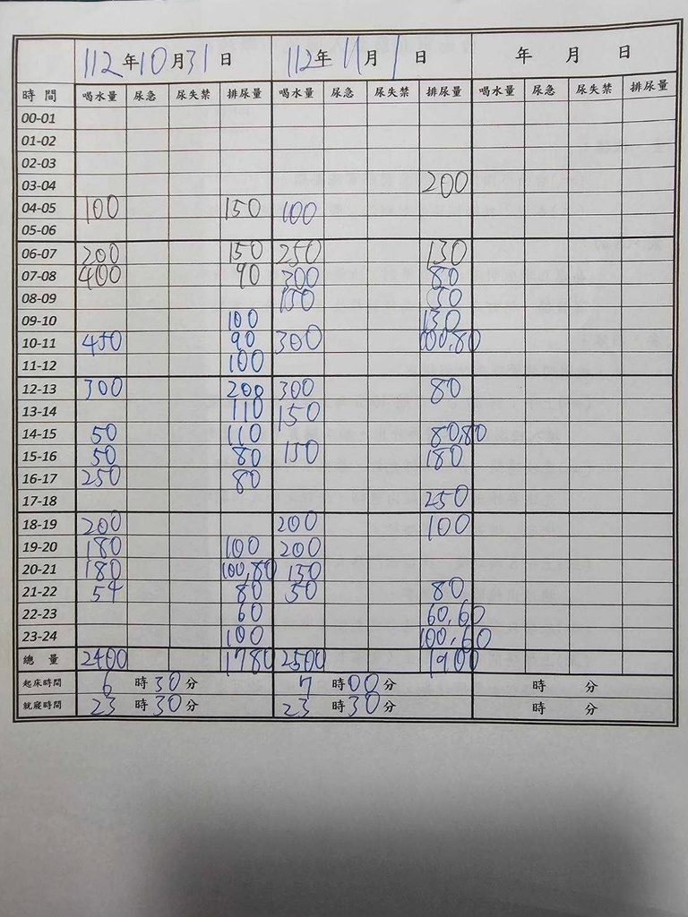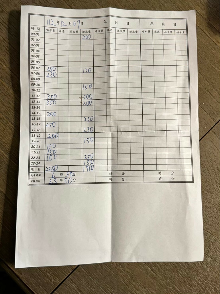可以看到我一天尿尿次數非常多!正常次數是每天5-7次,超過8次就算頻尿,而我竟然有12-16次,每次量也只有一點點!