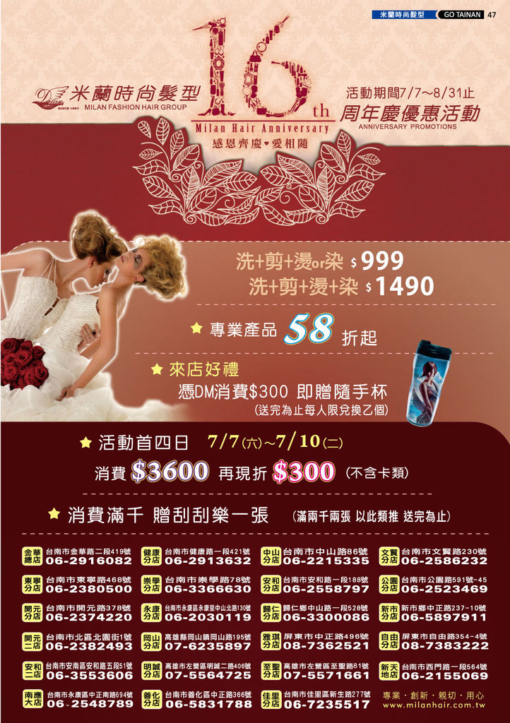 2012、2013最新流行的髮型趨勢,米蘭時尚髮型告訴你/妳,回歸大地的沙漠金色系髮型、復古風潮的紅紫色系髮型、未來銀色感的冷色系髮型,今年你想要什麼樣的頭髮造型呢?來米蘭時尚髮型就對了!米蘭時尚髮型連鎖:台南髮型在地第一連鎖品牌,成立於1997年,分店遍佈台南高雄屏東地區並積極朝向全國髮型品牌連鎖發展規劃,目前分店數達20家。 創業過程中,以著取之於社會,用之於社會的精神為社會公益付出奉獻,並把人員視為人才積極的教學培育,透過各種專業的髮型教學,創造人員為事業夥伴中堅幹 部,更為美髮業界創造出無數新生代優質出眾的髮型、頭髮造型設計師,也創造了屬於自己的領導團隊及教育團隊做為米蘭文化、精神、理念,落實傳承的先鋒。