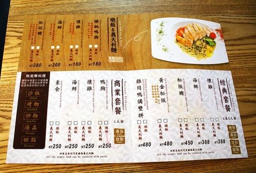 主餐分別搭配經典套餐(附烤物、沙拉、湯品、甜點)和商業套餐(附湯品、甜點)