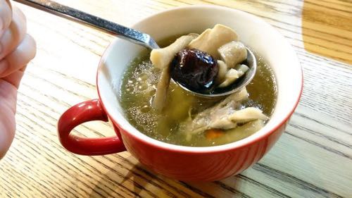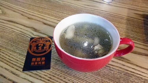 村吉的這碗湯裡有雞肉、柳松菇、白玉菇,還加上海鱺魚骨、紅棗、枸杞、香菇頭...等食材完全不加味精,但因為細心燉煮,所以能品嚐出食材的鮮甜。湯頭表面浮著一層雞油就是真材實料的證明拉!喝來順口卻不油膩,也喝的到海魚的鮮味。