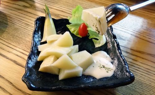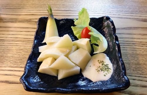 關廟產的當季綠竹筍,產地新鮮直送,綠竹筍剛煮熟立即冷卻,將竹筍的甘甜鎖在裡面。一口咬下清甜脆口,一旁搭配的醬料,有別於一般都搭配美乃滋,而是搭配微酸微甜的凱薩醬。
