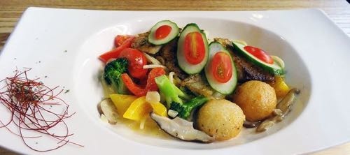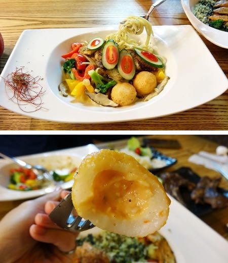 甜椒、香菇、青花菜..等材料也很新鮮,青菜的部份不會熟的過頭,吃的到菜的脆度及甜味。龍蝦沙拉球我超愛的,熱熱吃咬一口裡面包的龍蝦沙拉會爆漿出來,味道真的美味。另一個重點義大利麵,用蒜頭、白醬去調味拌炒,麵條Q彈而且吸飽了醬汁。
