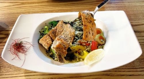 鮭魚的部分沒有腥味,取魚的的中間部位,所以有帶骨。同樣用海鹽簡單調味,提出鮭魚肉的精華鮮味,上面灑上義式綜合香料,真的是鮮香入味。