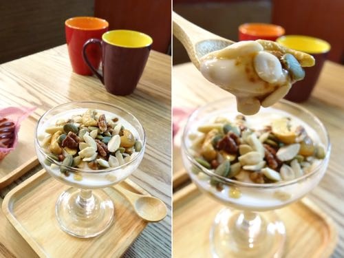酸酸的原味優格,灑上一點紅糖粉,擺上腰果、杏仁、核桃、葵花子等堅果, 在飯後剛好中和一下嘴巴的鹹度。