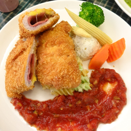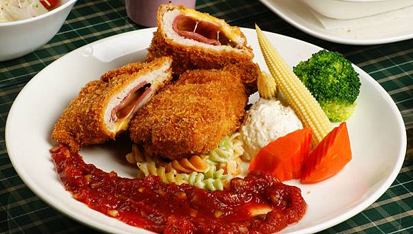藍帶豬排 採用新鮮的豬肌里肉灑上鹽,胡椒及香料,裹麵粉及蛋液煎至全熟,香味撲鼻而來,再淋上綠屋自製醬汁,或兩片豬里肌肉裹上火腿片與起司絲。裹粉油炸4分鐘,佐綠屋特調沙沙醬,微辣的感覺且口感層次多樣化。