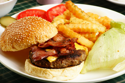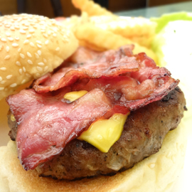 培根牛肉漢堡 手工漢堡肉煎熟透汁加上培根薯條堪稱綠屋的經典料理