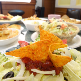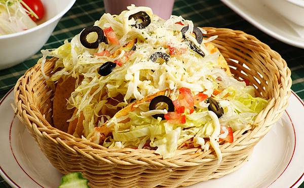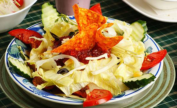 墨西哥脆餅沙拉 玉米脆片底加上豆泥及起士焗烤,再舖上大量生菜沙拉佐沙沙醬。