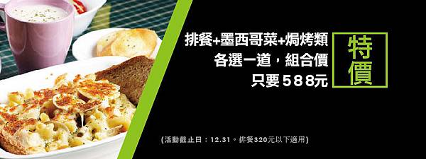 憑券 排餐加墨西哥菜加焗烤類,各選一道,組合價588元