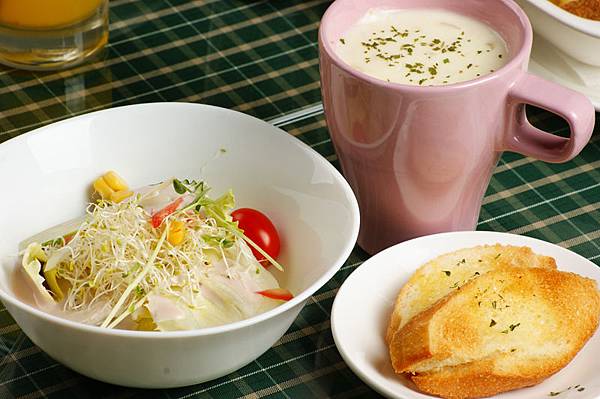 餐前沙拉、濃湯與麵包,皆可單點或配套餐,沙拉以八種新鮮蔬果搭配而成,可佐藍莓醬、義大利油醋及各式沙拉醬。