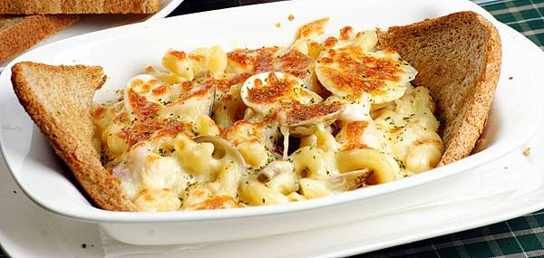 起司海鮮焗烤通心麵 用白醬搭配海鮮製成,五種海鮮通心麵焗鮮奶油白醬再焗烤,更多美味餐點都在,綠屋異國美食風味館。