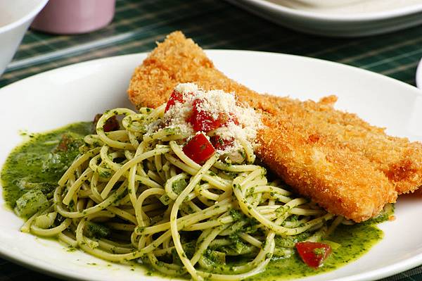 羅勒魚排義大利麵 新鮮鯛魚酥炸後佐綠屋特調的青醬,美味的義大利麵料理