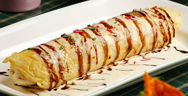 香蕉薄餅甜點 採用中筋麵粉及鬆餅粉拌勻煎成圓形薄餅再捲入整支新鮮香蕉加鮮奶油及巧克力醬