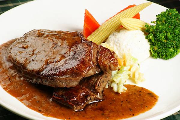 黑胡椒沙朗牛排 採用8盎司紐奧沙朗牛排以七分熟為標準,配上溫潤的特製黑胡椒或蘑菇醬,鮮嫩多汁,享受大口吃肉的幸福。