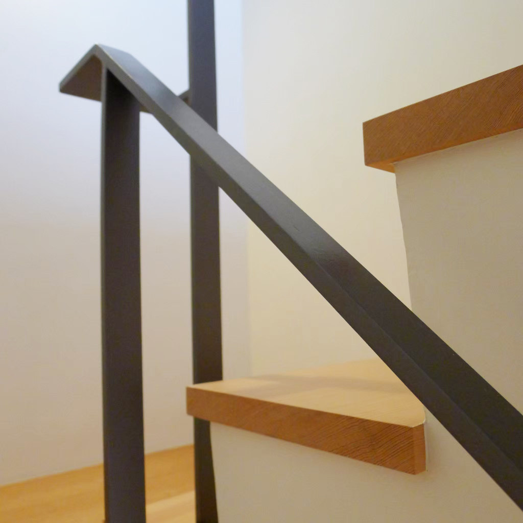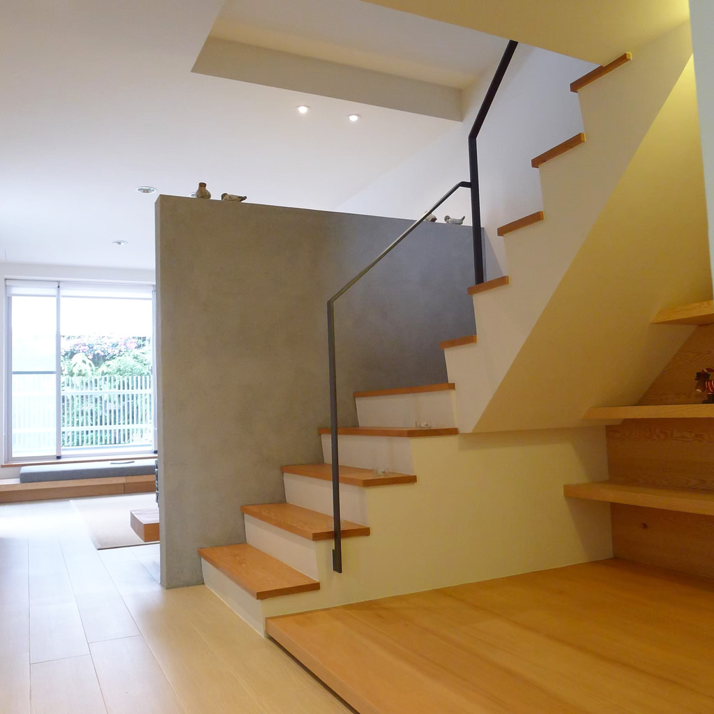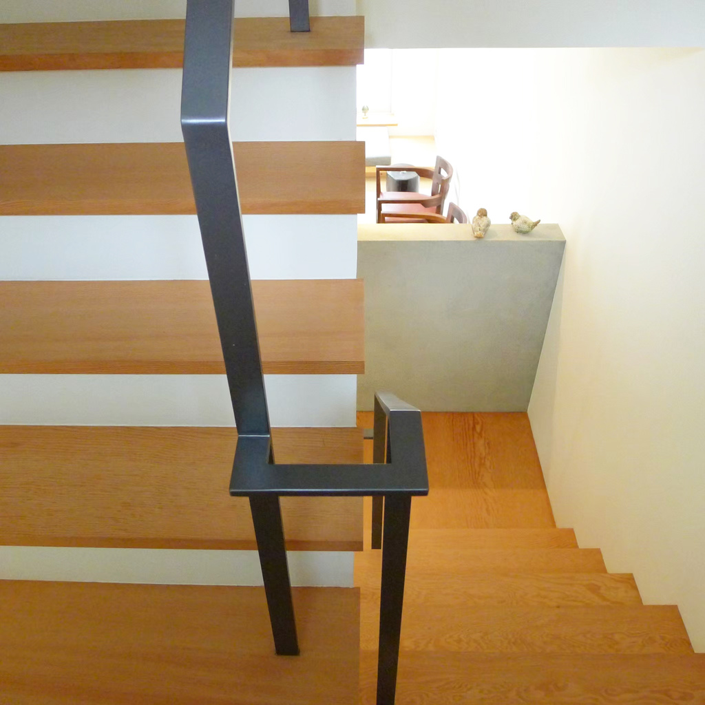 ▼樓梯設計將冷杉木板作為踏階延伸到樓上,老舊的木扶手也拆了,現在換成這個簡潔的設計,整個樓梯都變得年輕了。