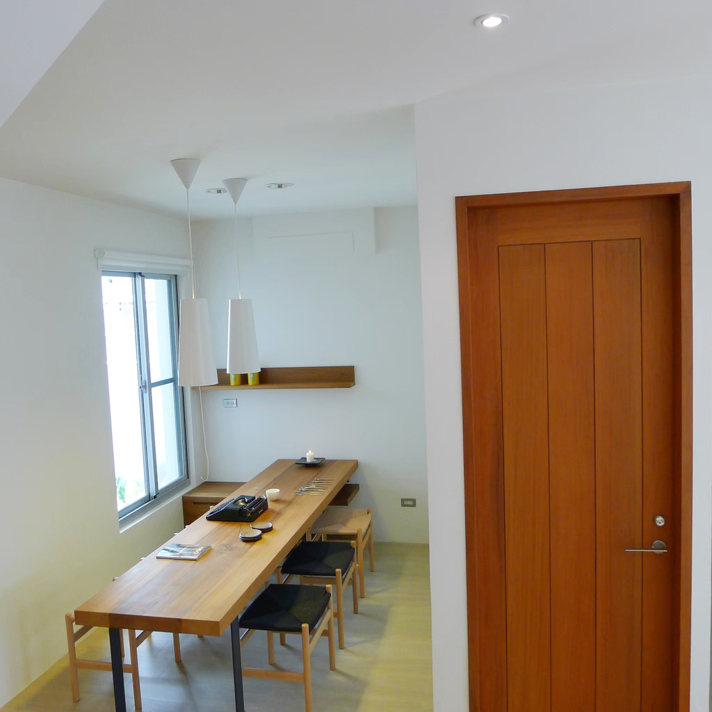 一二樓房間以最簡單的方式處理,住起來舒服就好。以實木門、木紋磚、白牆、崁燈和樸素的捲簾等元素為主,這樣的設計不僅耐看,而且具有很強的包容性,可以搭配各種風格的家具。