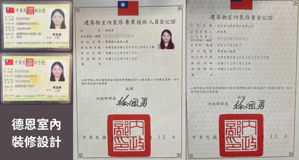也多虧德恩室內裝修設計,起初在設計上,郭設計師就很有想法與我們溝通討論,定案後效率開工,裝修也有保障,防水工程、電器、燈具皆保固ㄧ年