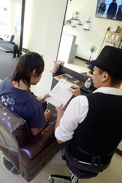 主要是了解關於你的頭髮的狀況,填完後造型師就開始跟表弟溝通想要的造型