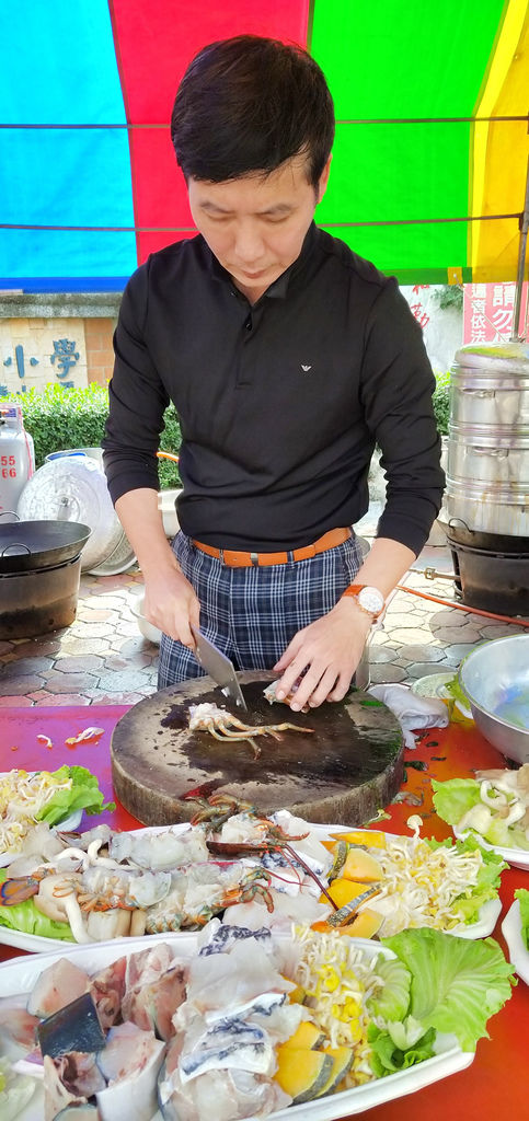 小泉師正在準備的這一道是活龍蝦龍膽斑鍋,龍蝦被剖開後,前面的觸角還在搖動著!難怪小泉師是許多人指定的名廚,海鮮都特地做好保鮮,帶到會場、上了沾板時,都還是活的!