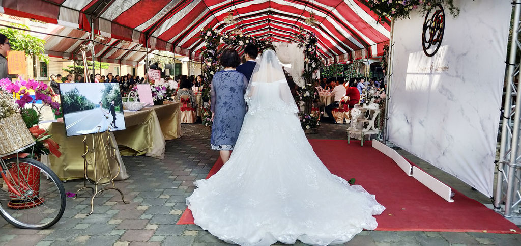 終於到了儀式和宴席的時間了。新娘的華麗裙擺和現場的佈置,全成了一種和諧、好看的畫面。我不僅為同學開心,也為自己能夠參與其中而感到榮幸。