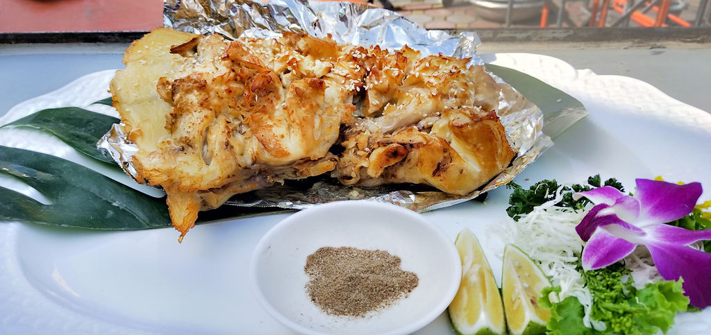 而糖燻則是台灣特有的煙燻方式,以紅糖去燻製、產生糖香後,龍鱈也呈現美麗的琥珀色。這道菜餚嚐起來不是甜的,但卻帶著紅蔗糖的香氣,再淋上一點檸檬汁、沾上一點簡單的胡椒鹽,嚐起來是很奇特、很少見卻又很好吃的口感和香氣。