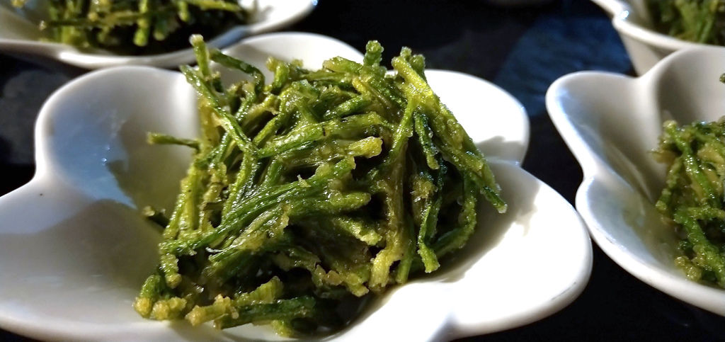 這一道是水蓮北海道干貝,在這經濟比早期富裕、資訊和硬體發達的年代裡,大家可能已經對生食級、口感脆嫩鮮甜的北海道干貝感到不陌生了!但將水蓮用油炸的方式呈現,反而才是大家比較少見的。而炸水蓮這道菜,大多要在山產店裡才比較看得到,兩者搭配起來,是名副其實海、陸組合。