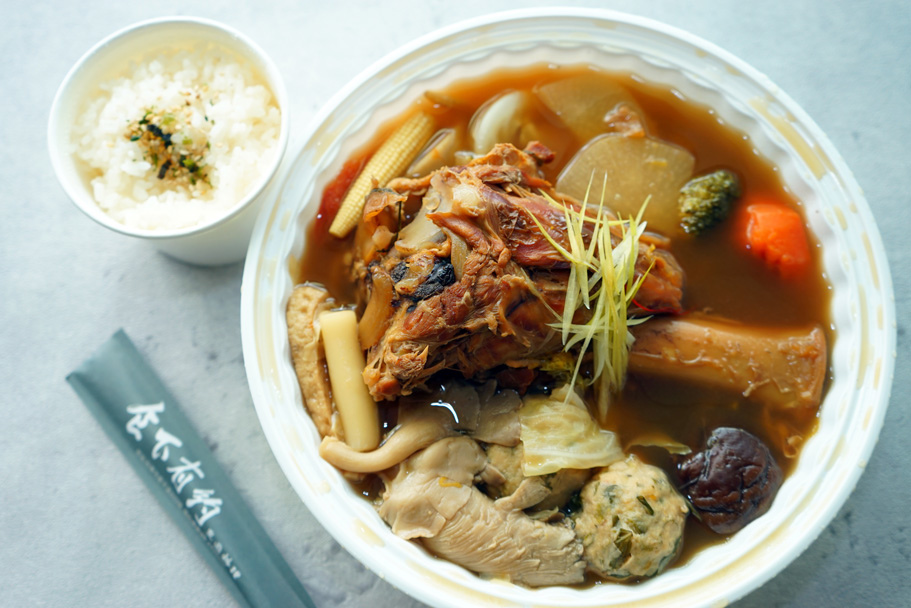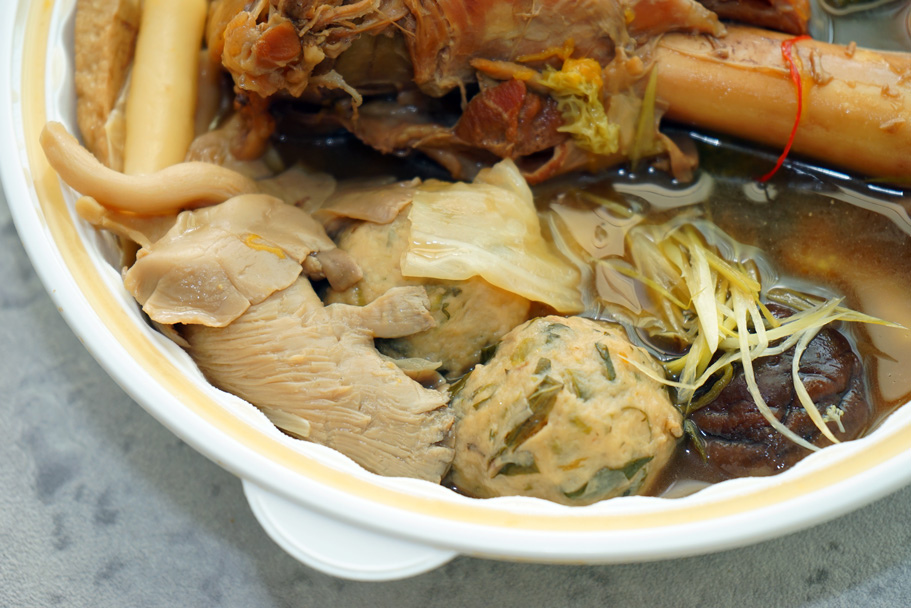 配菜也很豐富。有吸飽湯汁的綜合菇類、燉的軟嫩的紅白蘿蔔、鮮脆的玉米筍、花椰菜及Q彈的自製蔬菜魚丸,一點都不單調。