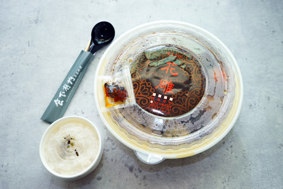 花雕煲牛膝餐盒夠有看頭吧!一開蓋強勁的花雕酒香馬上撲鼻衝出,搶戲到想忽略都沒辦法。盒蓋上附的特製辣醬,之前吃過真的很強。口水不自覺得分泌...要不是同事A在旁邊盯著,我還真想偷吃個幾口啊!