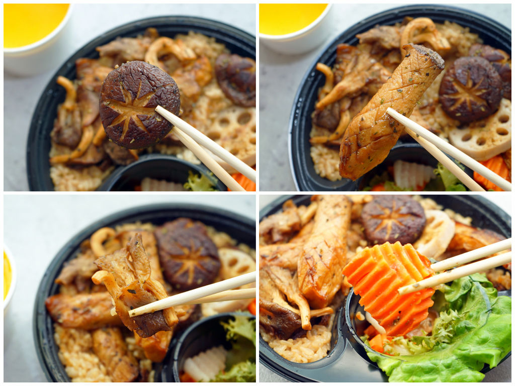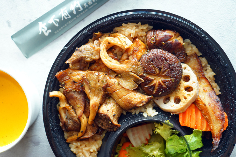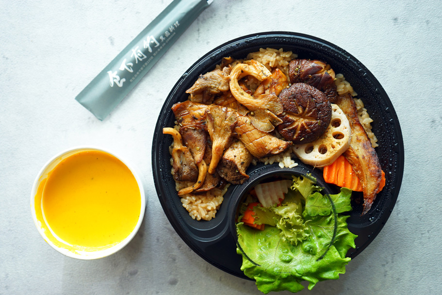 養生蕈菇+燉飯+素食醬。吃素的同事搭了這個純素的養生蕈菇餐盒。有別於千篇一律的素食便當,這盒滿滿的綜合菇類調味後再烤,呈現的是有點像是醬燒的鹹甜風味;配上稍微濕潤的燉飯,整體調整的很入味。只能說菇類人人會煮,但這盒卻是不簡單的口感。
