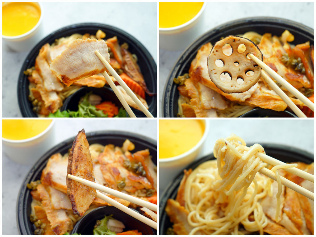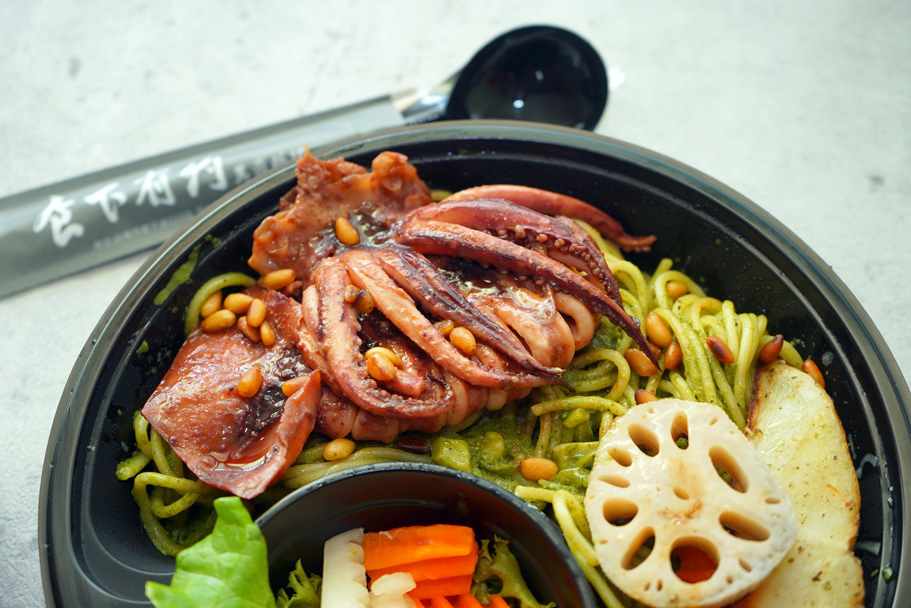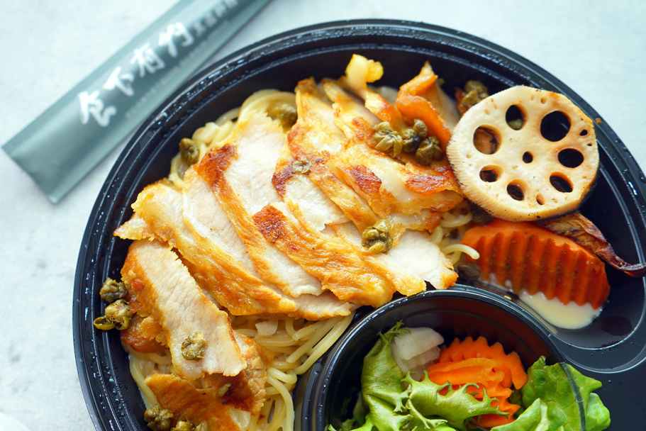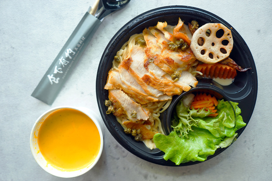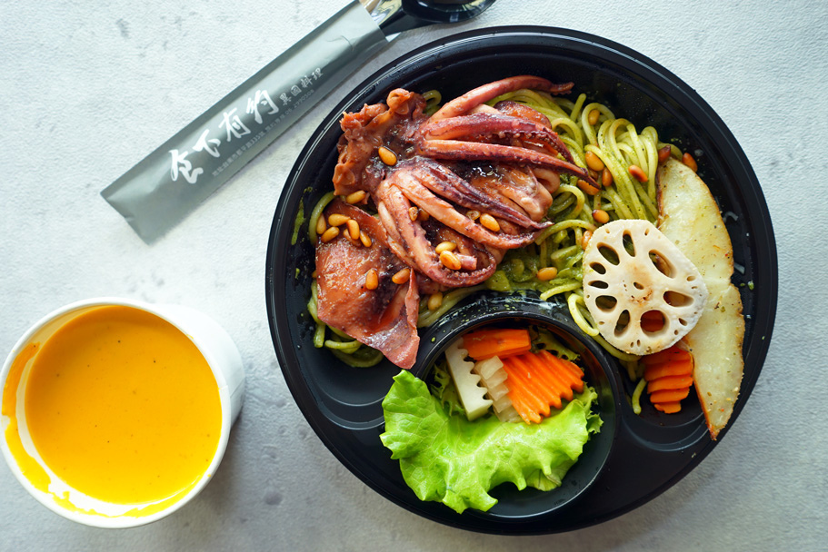 松阪豬+義大利麵+白醬。帶有點脆感的香煎松阪豬與義大利的搭配相當唯妙唯俏;白醬濃郁卻不過膩,火烤過的蓮藕、蘿蔔、地瓜也是不過度調味的那種;除了些許的焦香,其餘的就是食材本身的天然甜味,整體的調性溫和卻又豐富。每份餐盒還會附上南瓜泥熬製的濃湯,厚實的甜味將附餐湯品提高到不可思議的高度。