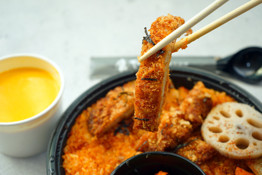 炸豬排+燉飯+韓式辣醬。真的是怎麼搭怎麼可以耶!要不是同事覺得特別這樣搭配,我還真沒想過韓式辣醬燉飯可以跟炸豬排這麼媒合。不只在視覺和味覺上超有魅力,用酥酥的麵衣完整包覆的多汁肉排,入口後在舌尖上的觸覺也有著滿分的表現。