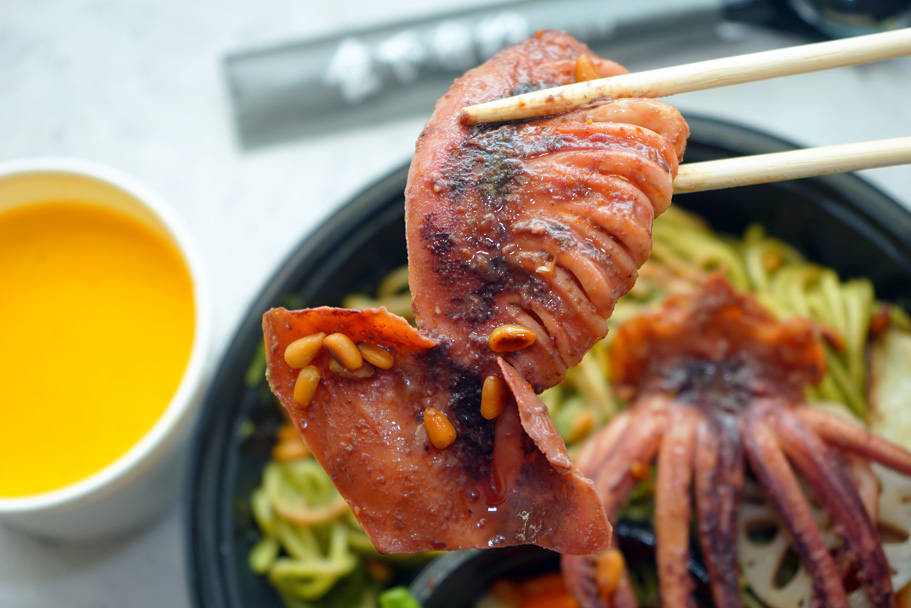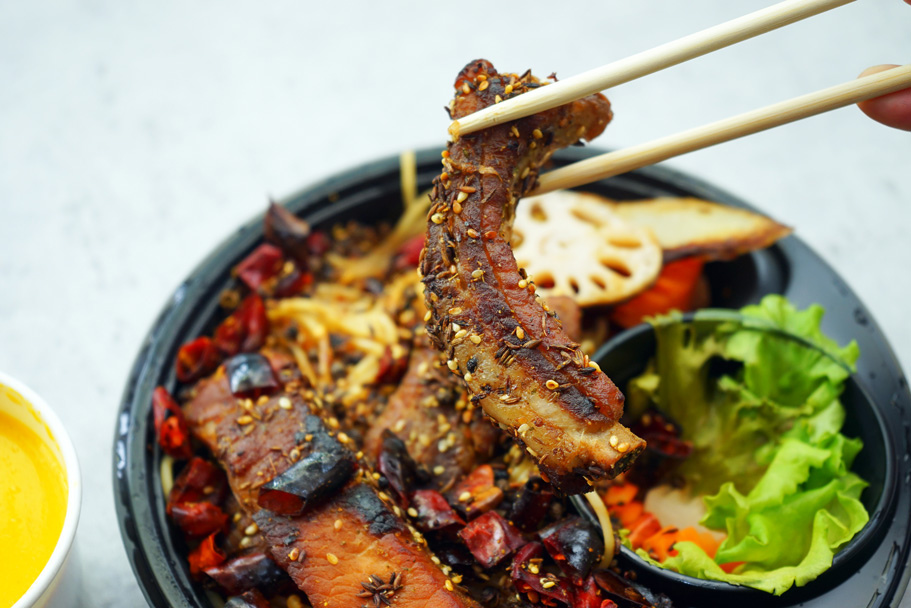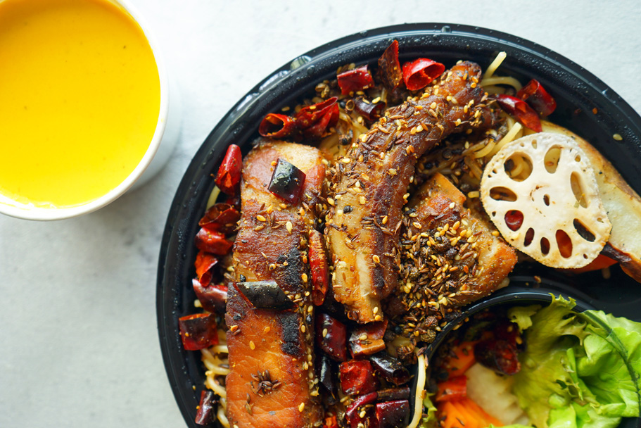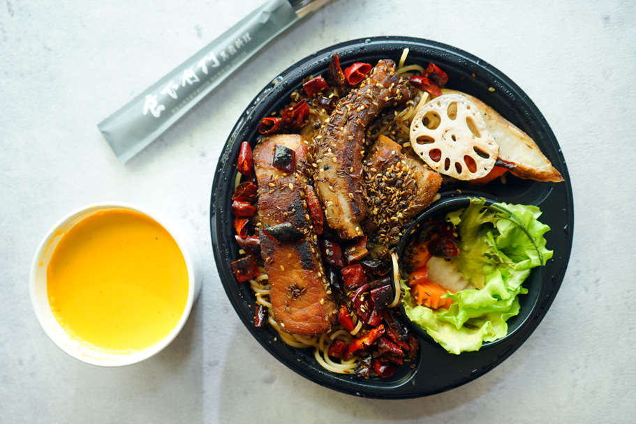 豬肋排+義大利麵+港式XO。不要被塞滿縫隙的紅色辣椒嚇到了,它們的存在扮演的是襯職的提味作用,混入香料和花椒營造出的香麻空間感,留下辣香卻不死辣,與醃製過的水潤烤豬肋排根本絕配!受不了了,趁同事沒注意,偷夾一塊放到自己的那盒。