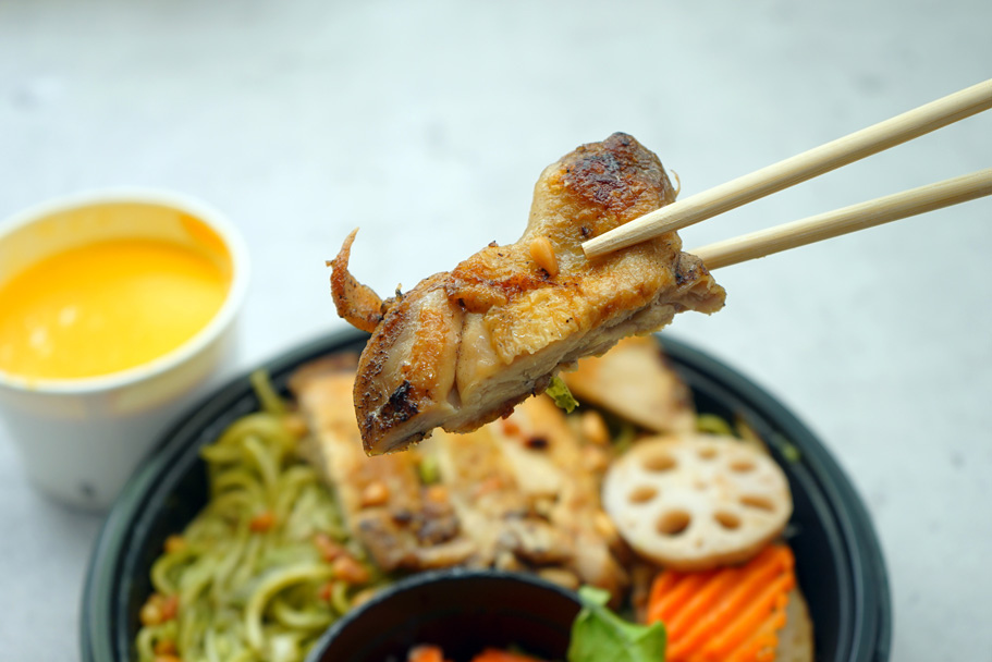 雞腿排+義大利麵+青醬。將青醬雞排義大利麵濃縮成餐盒的概念,讓午餐也可以吃得很贅沢。拌面的橄欖油一吃就感覺得出相當高檔,油耗味零,取而代之的是一絲的清香。煎的金黃的雞排肉質柔軟到不行,好吃到這麼犯規真的是被允許的嗎XD?對了!我怎麼會知道呢?當然是因為我又偷夾啊…