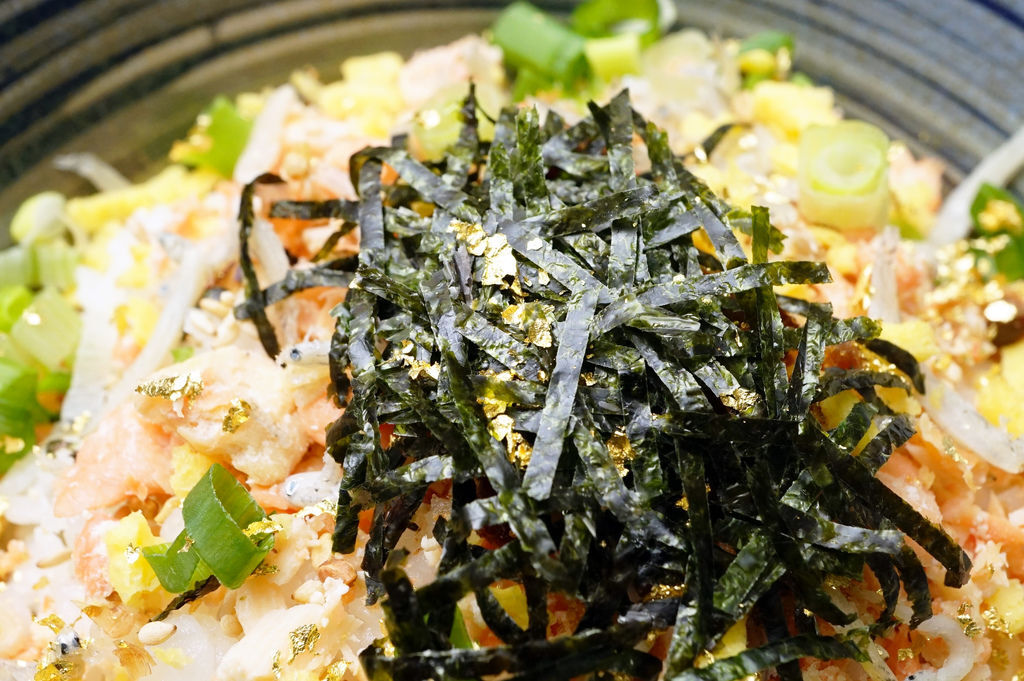 大哥點的鮭魚綜合茶泡飯,上面真的有一片片的金箔耶!除了鮭魚外,還有吻仔魚、蔥花、烏魚子和海苔等做為點綴;各種顏色搭配加上金箔後整個質感就完全不一樣了。而且份量很有誠意,料多到都快看不見白飯了耶!