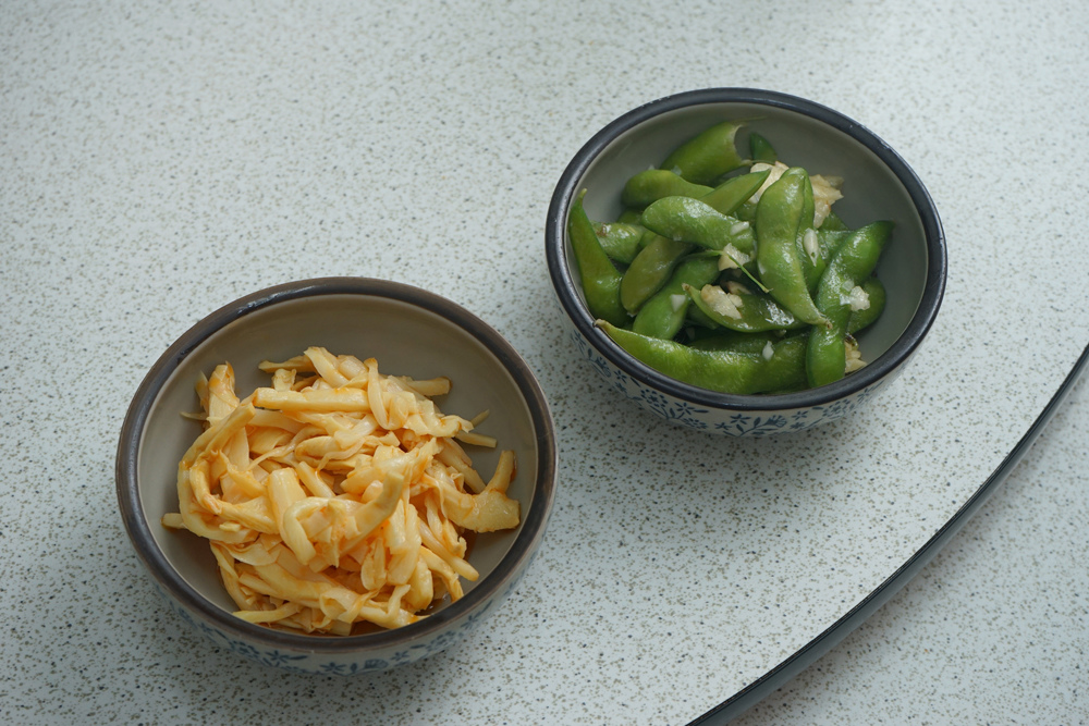 這是老闆特別招待的小菜,毛豆跟筍絲。