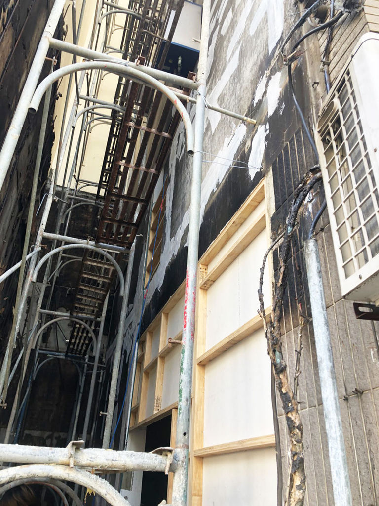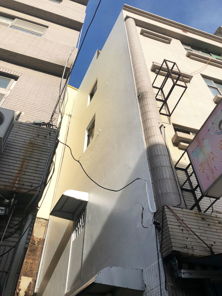 與廠商都溝通好就開始搭鷹架施工了!外牆漆上白色的防水漆,在一樓側邊留了一扇門方便進出。