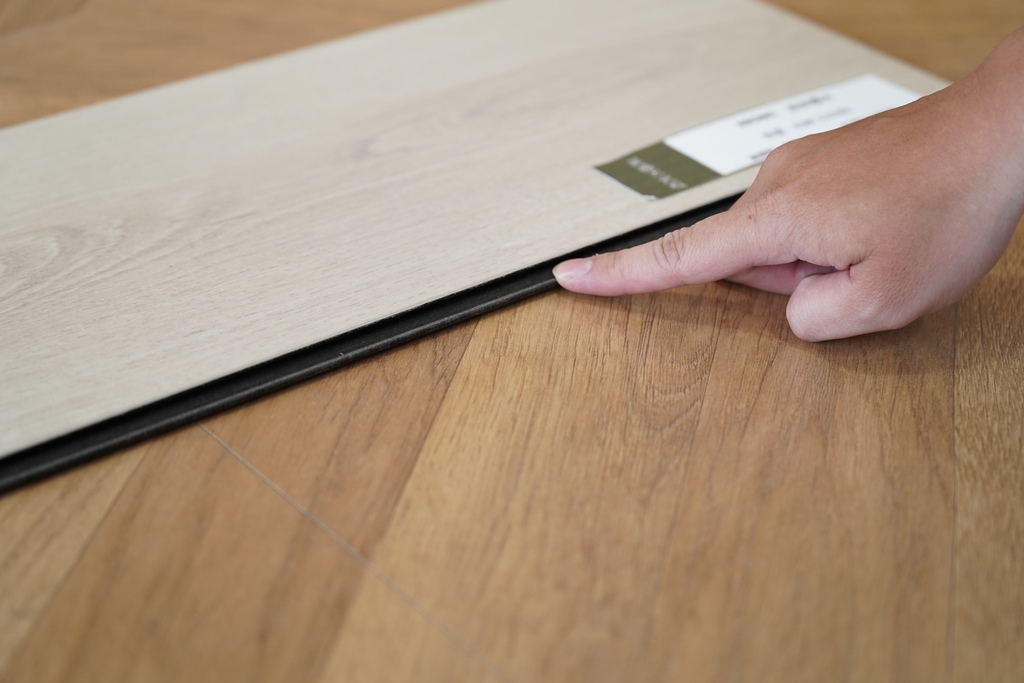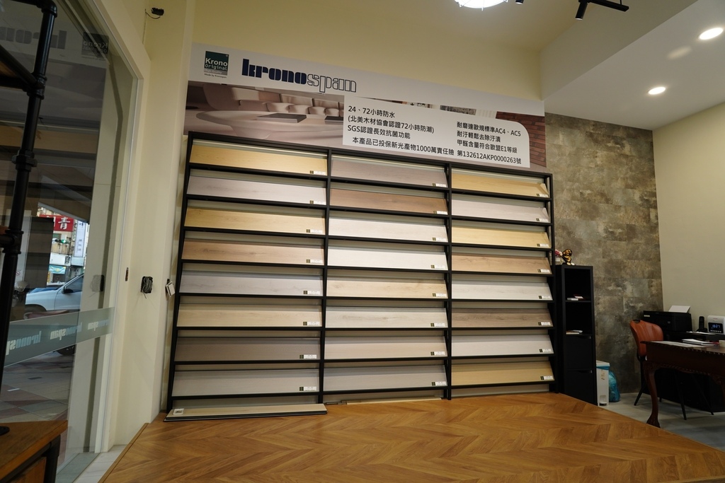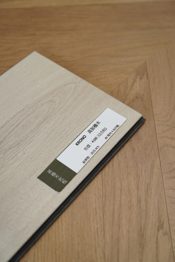 ▼他們主推德國Krono超耐磨地板,集結了多項優點,例如:北美木材協會72小時防潮認證、歐規AC4/AC5耐磨、耐汙、SGS長效抗菌、甲醛含量E1等級、卡扣式設計、4V導角4面封蠟等等。