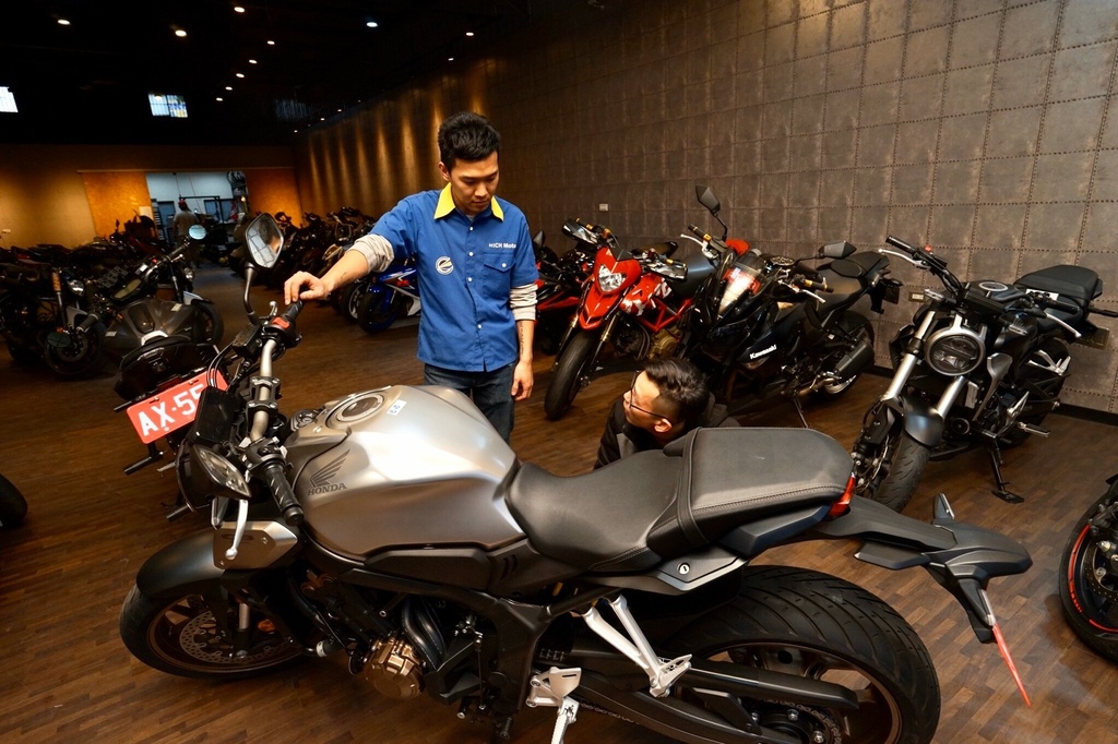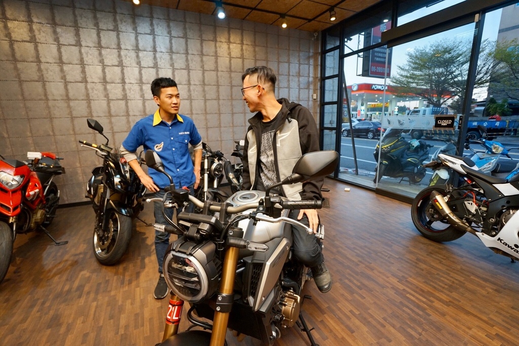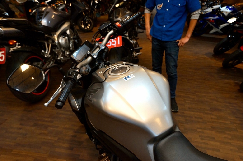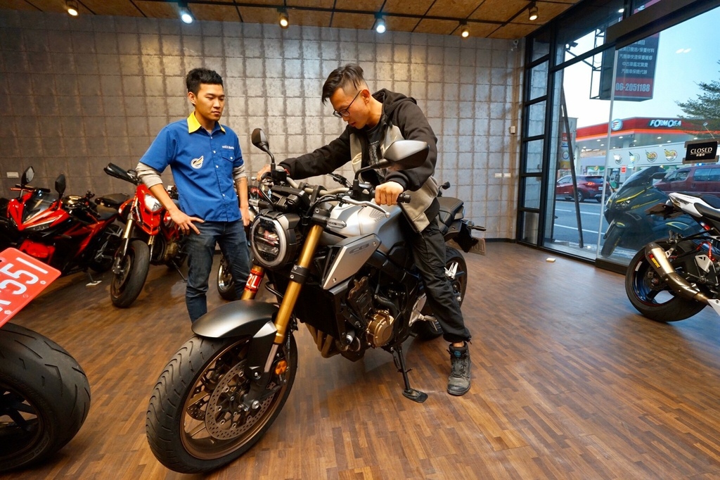 ▽檢查之後我朋友相中一台重機,型號是Honda CB650R。迫不及待叫店員牽來看看。